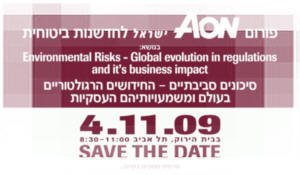 חברת Aon, ברוקר הביטוח הבינלאומי הגדול בעולם, מקיימת פורום מס' 4 לחדשנות ביטוחית, בנושא: סיכונים סביבתיים - החידושים הרגולטוריים בעולם ומשמעויותיהם העסקיות. הפורום יעסוק בהשלכות הרגולציה על עולם העסקים ומתן האשראי ובמענה שמציעה Aon לתחום הסיכונים הסביבתיים. הפורום יתקיים ביום רביעי, 4.11 בין השעות 08:30 – 11:00, בבית הירוק בתל אביב.