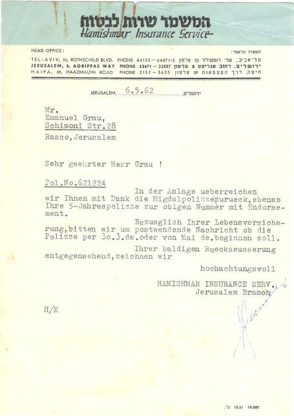 ההיסטוריה של הביטוח > מכתב של המשמר שרות לביטוח משנת 1962 בשפה הגרמנית