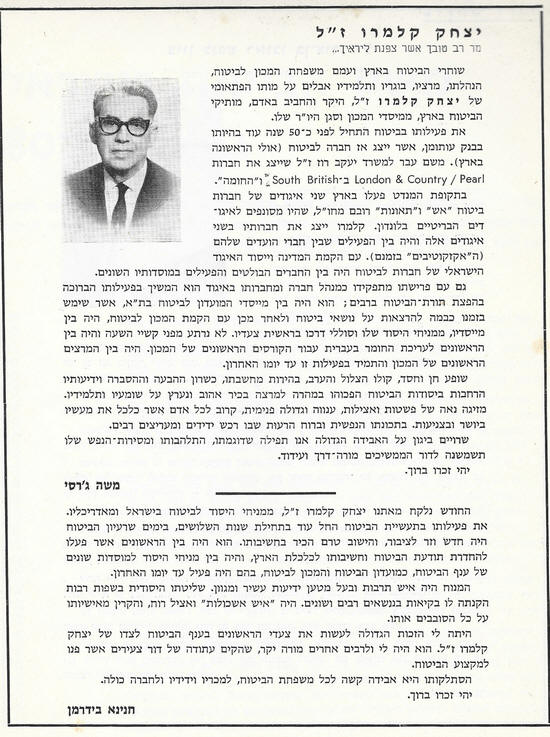 קלמרו, ז"ל, שהיה מנפילי ענף הביטוח בישראל, כפי שנכתבו בביטאון